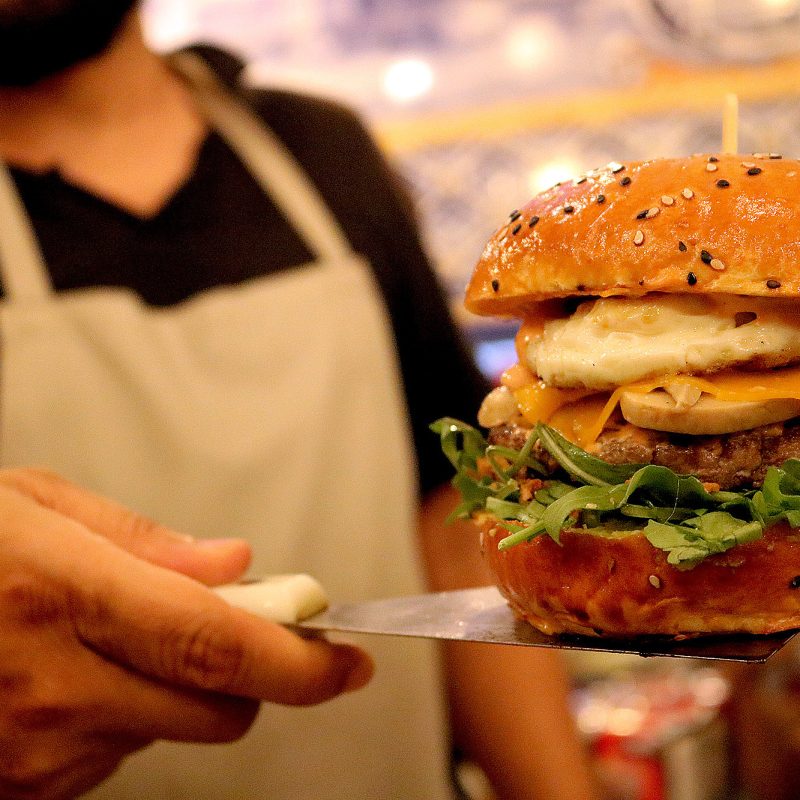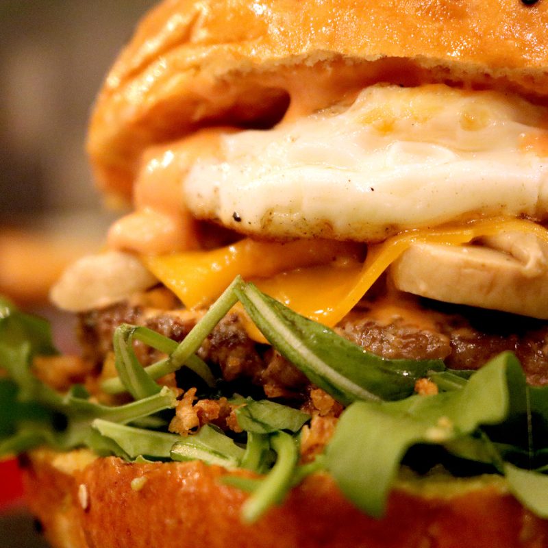€8.99Pao Normal, Ovo, Queijo Cheddar, Cebola Frita, Cogumelo, Rucula, Maionese de Alho (Molho Cocktail)